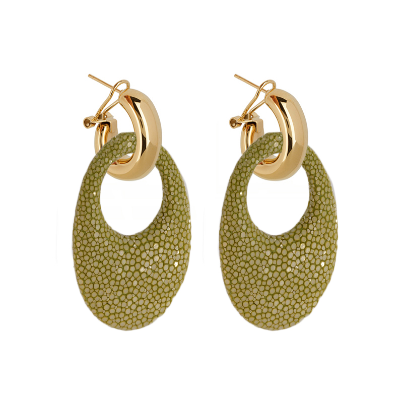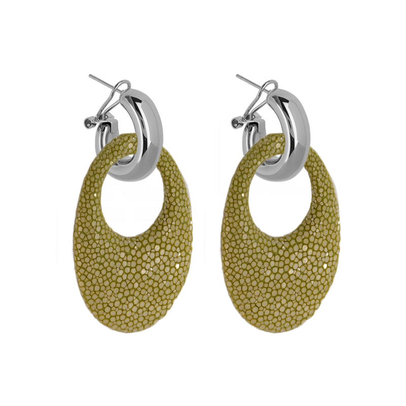 Amjoya Oorbellen Marbella kiwi, deze prachtige kiwi groene Stingray hangers zijn gemaakt van roggeleer en kunnen door het mix & match systeem met de creolen eindeloos worden verwisseld. Hierdoor kun je het bij elke outfit combineren. Het leer heeft een unieke structuur en is onverwoestbaar. De tientallen kleine schitteringen geven een bijzonder, bijna sprookjesachtig effect, waardoor het lijkt alsof het leer is bezaaid met minuscule diamantjes. Niet voor niets worden deze roggen dan ook de diamanten van de zee genoemd. De rog wordt voor consumptie gekweekt in onder andere Azië. Het leer is een restproduct. De creolen van Amjoya zijn er in 2 kleuren, verzilverd en 18k verguld geel goud. De stingray hangers zijn in meer dan 15 kleuren te verkrijgen en in 3 verschillende modellen. Kijk voor onze andere kleuren en modellen onder AMJOYA.