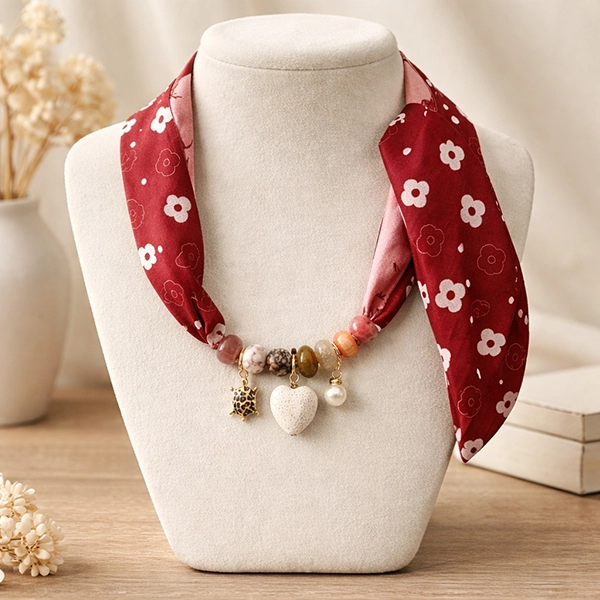 Sjaalketting Flower red. Deze accessoire is een sjaalketting (of scarf necklace), een stijlvolle en veelzijdige combinatie van een sjaal en een ketting in één. De lange, smalle sjaal van satijnachtige stof met een wieber dessin heeft heldere rood-, roze- en witte tinten. De stof heeft een mooie glans en valt soepel, wat hem luxe laat ogen. In het midden van de sjaal is een rij kralen verwerkt die als een echte ketting fungeert. De kralen zijn heel gevarieerd en hebben een bohemian / etnische / natuurlijke uitstraling. Er hangen drie opvallende bedels aan; een rvs tijgerprint schildpad, een lavasteen wit hart en een witte parel in een goudkleurige setting.