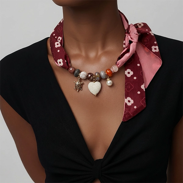 Hoe draag je zo’n sjaalketting? Je kunt de sjaal op verschillende manieren knopen: losjes om de nek met de ketting vooraan, strakker als een col, of juist met een grote strik aan de zijkant. De stof is lang genoeg om ook als haarband, enkelband of polsband te gebruiken.